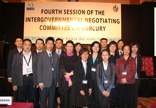 | The fourth session of the Intergovernmental Negotiating Committee to prepare a global legally binding instrument on Mercury (INC4) was held in Punta del Este, Uruguay, from 27 June to 2 July 2012. As an important role, the Chinese delegation, taken the lead by MEP (Ministry of Environmental Protection), attended the session and participated in all substantive discussions on the basic elements of every topic in mercury documents, deeply and comprehensively. The members of Chinese delegation were from MEP, MOFA (Ministry of Foreign Affairs), NDRC (National Development and Reform Commission), MIIT (Ministry of Industry and Information Technology), CPCIF (China Petroleum and Chemical Industry Federation), PKU (Peking University) and THU (Tsinghua University), etc.