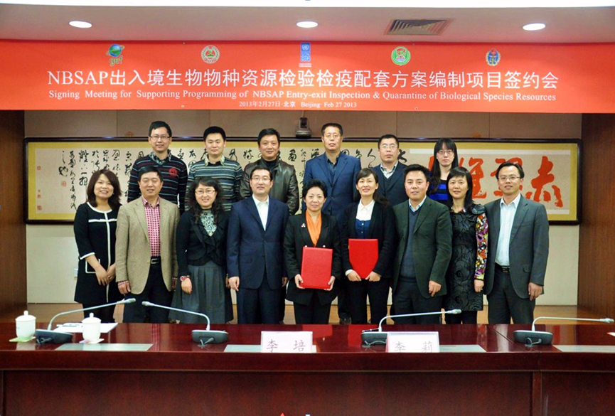 On February 27, 2013, the inception meeting for development of NBSAP Programme on Entry-Exit Inspection& Quarantines of Biological Species Resources (Year 2011-2030) conducted by Quality Supervision, Inspection and Quarantine of China(AQSIQ) and supported by FECO was successfully held. Cai Lei, Deputy Division Chief of the Department of Nature and Ecology Conservation, MEP, Zhao Zenglian, Deputy Director-General of the Department of Animal and Plant Quarantine Regulatory, AQSIQ, Li Pei, Deputy Director-General of FECO/MEP, Ma Chaode, Project Manager of UNDP China and Li Li, vice president of Chinese Academy of Inspection and Quarantine attended the meeting and respectively delivered speeches. A brief signing ceremony was conducted following the representatives from the project undertaking agencies introducing to participants the overall implementation plan. Ms. Li Pei, on behalf of FECO/MEP signed the agreement with the Chinese Academy of Inspection and Quarantine.